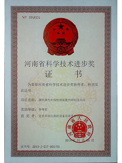 我公司自主研發(fā)的“煙絲彈性在線檢測(cè)裝置”獲得了河南省科學(xué)進(jìn)步三等獎(jiǎng)